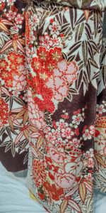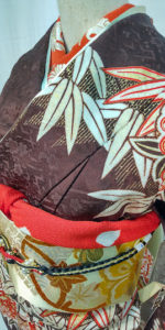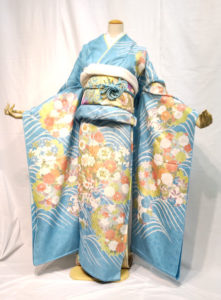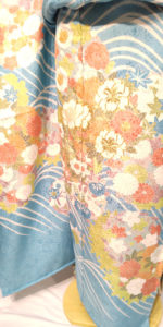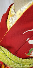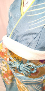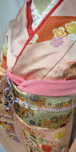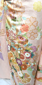 刺繡衿も熨斗の柄に 帯上は重めの縮緬地に刺繍で花柄をあしらってます